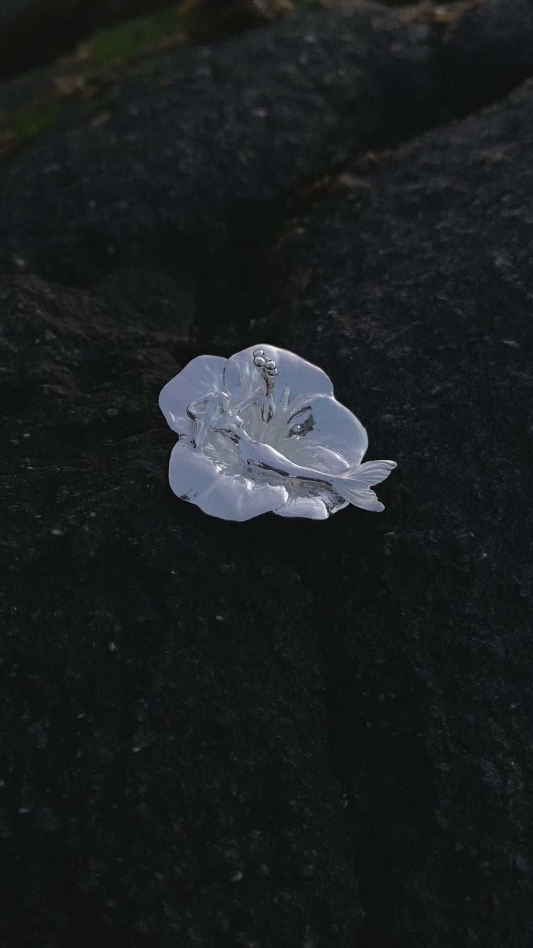 Colgante esculpido en plata 950, una sirena descansa soñando sobre una flor de hibisco sostenida y confiada de su soberanía, un amuleto para usarlo día a día
